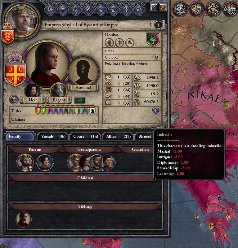 - Uncles. Your new character is a 2-year-old with the ‘drooling moron’ trait. He’s rated at 0 in every stat. Even his twin sister hates him. Thanks to dear Daddy’s martial exploits, the treasury is empty, the armies are dead, and family authority shaky. Along comes dear uncle with his shiny blood claim, and it all goes like the proverbial fairytale. In no time at all moron-boy is reduced to count of a single African province which provides no income and no levies thanks to being recently conquered. Did I mention kindly Uncle has a different dynasty name to his darling nephew? Control will not pass to him should Tiny Tim have a tragic accident…